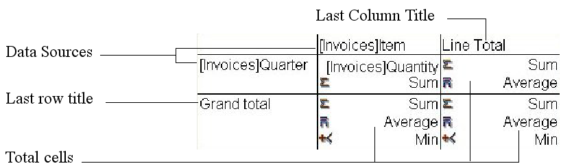 - タイトルセル: これらのセルは、最終カラムまたは最終行のタイトルを格納します。この内容は変更可能です。
