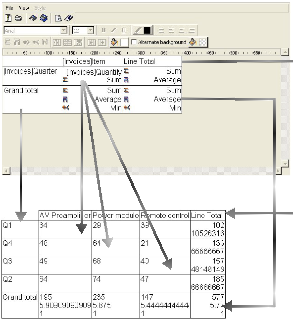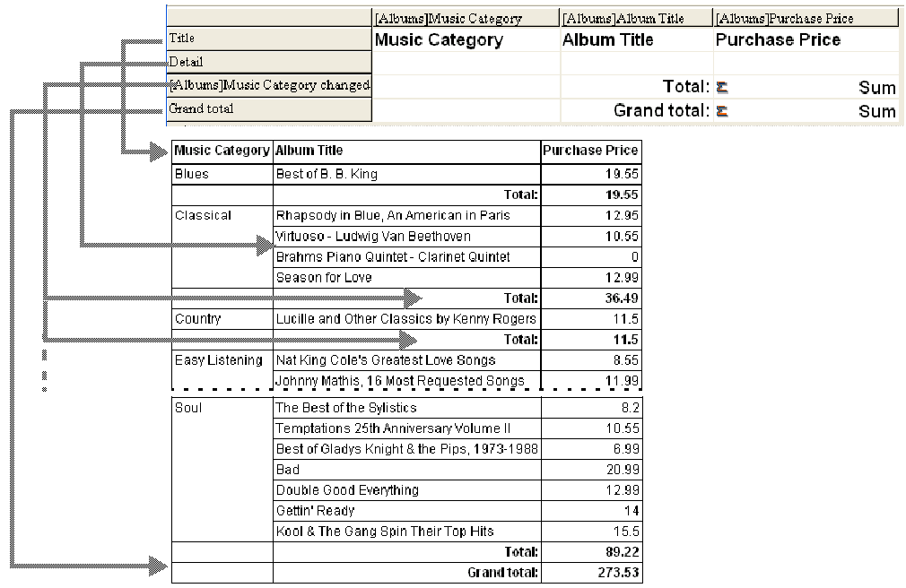 次の図は、完成したクイックレポートデザイン、およびデザイン仕様と印刷結果の関係を示しています: