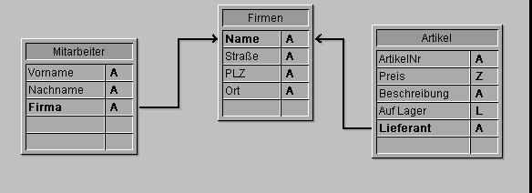 Im folgenden Beispiel sind drei Tabellen über automatische Verknüpfung miteinander verbunden. Die beiden Tabellen [Mitarbeiter] und [Artikel] haben eine Viele-Zu-Eine Verknüpfung zur Tabelle [Firmen].