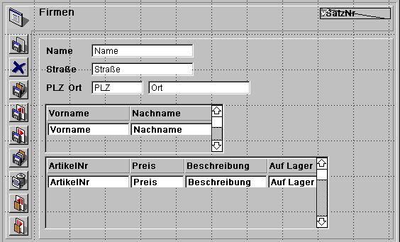 Das Formular für die Tabelle [Firmen] zeigt die verknüpften Datensätze aus den beiden anderen Tabellen [Mitarbeiter] und [Artikel] an.