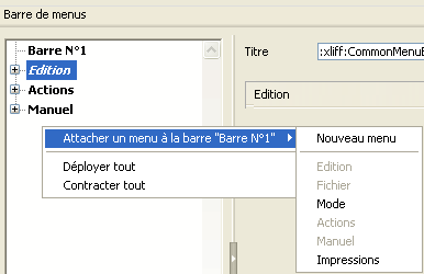 Une fois que vous avez créé un menu, vous pouvez le rattacher à une barre de menus. La connexion d’un menu à une barre de menus s’effectue par glisser-déposer, par le menu d’options ou par le menu contextuel de la zone centrale.