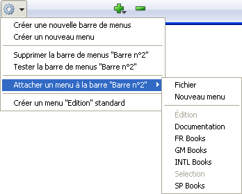 • Utiliser le menu contextuel : cliquez sur une barre de menus afin d’afficher son contenu dans la liste centrale ; cliquez avec le bouton droit dans cette zone et sélectionnez la commande Attacher un menu à la barre “nom barre” > puis choisissez le menu à utiliser comme sous-menu :