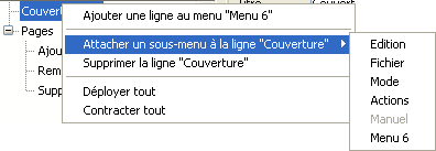 • Utiliser le menu contextuel : dans la liste centrale, cliquez avec le bouton droit sur la ligne à laquelle rattacher le menu. Dans le menu contextuel, sélectionnez la commande Attacher un sous-menu à la ligne “nom ligne” > puis choisissez le menu à utiliser comme sous-menu :