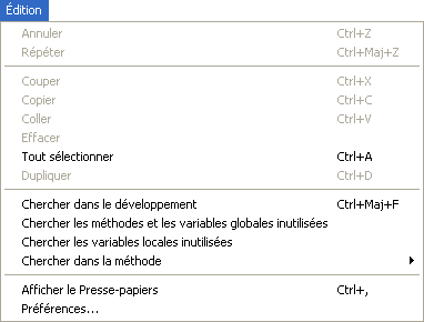 Ces commandes sont accessibles dans le menu Edition du mode Développement :
