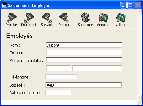 4D affiche le formulaire entrée courant de la table courante dans une fenêtre de type recherche par l’exemple. Seuls les boutons Valider et Annuler du formulaire sont actifs.