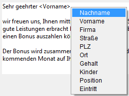 Sie können festlegen, wie ein eingebundenes Datenfeld bzw. eine Variable dargestellt wird. Dazu setzen Sie direkt nach dem Namen des Datenfeldes oder der Variablen ein Semikolon, gefolgt von einem Anzeigeformat. Zum Beispiel berechnet die eingebundene Variable <vBonus;€###.##0,00> die Höhe des Bonus für die betreffende Person und zeigt ihn im Format Euro an. Weitere Informationen dazu finden Sie im Abschnitt Anzeigeformate.