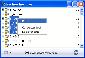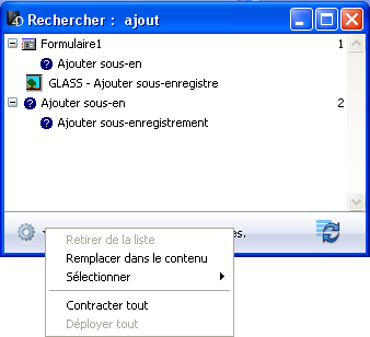 La fonction de remplacement dans le contenu permet de remplacer une chaîne de caractères par une autre à l’intérieur des objets listés dans la Fenêtre de résultat. La commande Remplacer dans le contenu est disponible dans le menu d’options de la fenêtre :