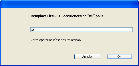 Lorsque vous sélectionnez cette commande, une boîte de dialogue vous permet de saisir la chaîne de caractères qui remplacera toutes les occurrences trouvées par la recherche initiale :