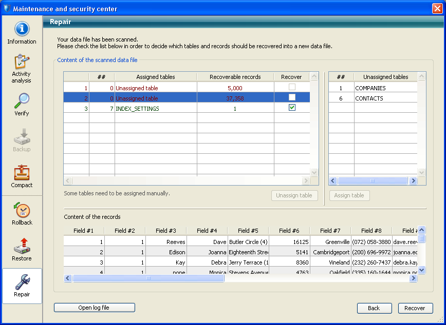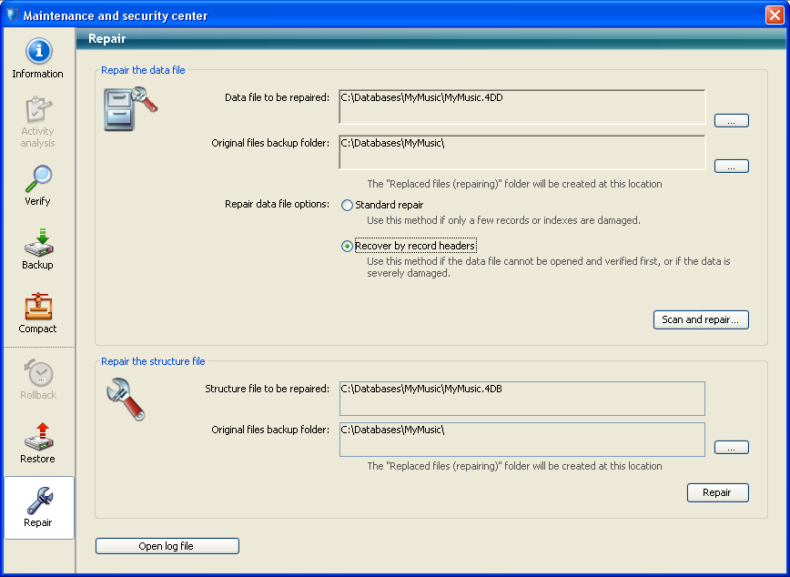 数が多くないレコードやインデックスが損傷を受けているケースでは、標準の修復を選択します。データは圧縮および修復されます。このタイプの修復を行うためにはデータファイルとストラクチャーファイルが対応していなければなりません。