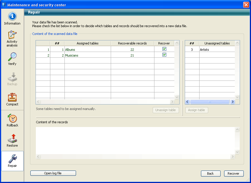 修復対象のデータファイルを選択したら、修復またはスキャンおよび修復...ボタンをクリックすると、修復処理が開始されます (選択した修復オプションによりボタンが変化します)。レコードヘッダーによる再生を選択した場合、再生する項目を選択するためのダイアログが表示されます (レコードヘッダーによる再生参照)。