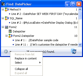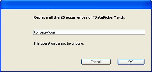 • If a method or form concerned by a "replace in content" operation is currently being edited by the same 4D application, it will be modified directly in the open editor (no warning appears). Forms and methods modified in this way are not saved automatically: you will need to use the Save or Save All command explicitly to validate the changes.