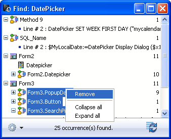 • Replacing is always carried out among all items found in the list and not just for a selection. However, it is possible to narrow the replacing operation by first reducing the contents of the list using the Remove command in the context menu: