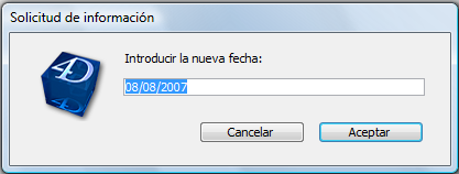 $vdPrompt:=Date(Request("Introduzca la nueva fecha:";String(Current date)))Mostrará la siguiente caja de diálogo (en Windows):