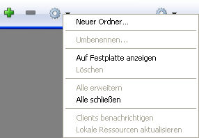 Die Steuerleiste am unteren Rand enthält die Schaltflächen und sowie ein DropDown-Menü mit Aktionen. Die Schaltfläche legt im ausgewählten Ordner bzw. auf der obersten Ebene einen neuen Ordner an. Die Schaltfläche löscht den ausgewählten Ordner, sowie seinen Inhalt.