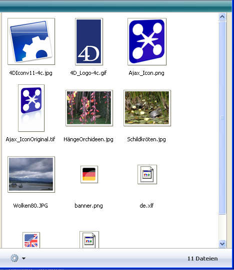 • Bei Anzeige als Thumbnail erscheinen die Dateien als Thumbnails. Die Bilder erscheinen als Miniaturansicht, wenn 4D das Bildformat erkennt, andere Bildtypen erscheinen mit dem Icon des Systems.