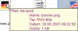 Ziehen Sie die Maus über ein Thumbnail, erhalten Sie weitere Informationen wie Pfadname (relativ), Name, Typ, Änderungsdatum und -zeit sowie Größe.