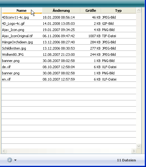 • Bei Anzeige als Liste erscheinen die Dateien der gewählten Ordner als Tabelle. Jede Tabelle zeigt Name, Änderungsdatum und -zeit, Größe und Typ der einzelnen Dateien: