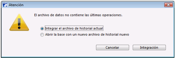 Si el archivo de historial actual o un archivo de backup de historial tienen el mismo número que el archivo de backup se guarda en la misma carpeta, 4D examina su contenido. Si contiene operaciones que no están presentes en el archivo de datos, el programa le propone integrar estas operaciones. La integración se efectúa automáticamente si la opción de integración automática del historial está seleccionada (consulte Restauración Automática).