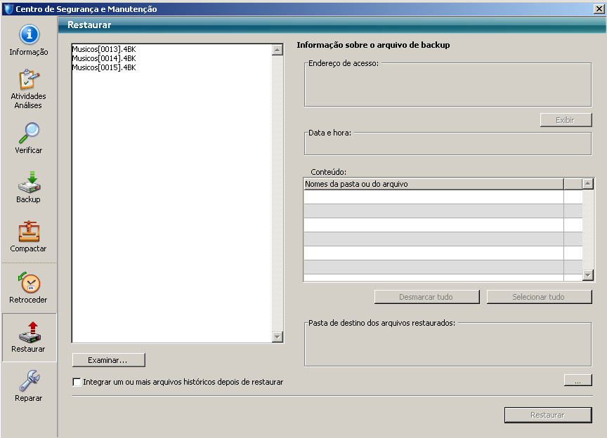 • Conteúdo: conteúdo do arquivo de backup. Cada elemento da lista está associado a uma caixa de seleção, que permite especificar se você deseja restaurar ou não. Também é possível utilizar os botões Selecionar tudo ou Desmarcar tudo para definir a lista de elementos para restaurar.