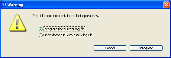 Se não tiver selecionado a opção de integração automática do arquivo de histórico (ver Integração sucessiva de vários arquivos de histórico), aparece uma caixa de diálogo de alerta durante a abertura do banco quando 4D constata que o arquivo de histórico contém mais operações das que foram efetuado no banco.