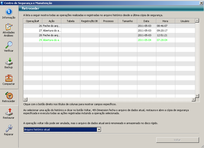 Assim é como funciona a função retroceder: quando o usuário clique no botão Voltar atrás, 4D fecha o banco atual e restaura o último backup de dados do banco. O banco restaurado se abre e 4D integra as operações do histórico até a operação selecionada. Se o banco não for guardado, 4D parte de um arquivo de dados vazio.