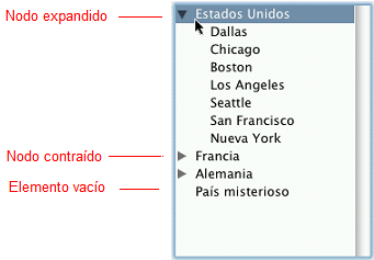 En la apariencia Macintosh, un icono de flecha a la derecha indica los nodos contraidos y una flecha descendente indica los nodos desplegados. Los nodos sin elementos hijos no tienen icono. Esta es una lista jerárquica por defecto con apariencia Macintosh:
