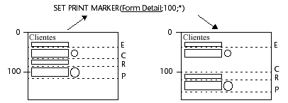 El comando SET PRINT MARKER permite definir la posición de un marcador durante la impresión. Combinado con los comandos Get print marker, OBJECT MOVE o Print form, este comando le permite ajustar el tamaño de las áreas de impresión.