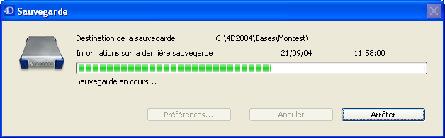 La sauvegarde est alors déclenchée avec les paramètres courants. Vous pouvez utiliser la Méthode base Sur démarrage sauvegarde et Méthode base Sur arrêt sauvegarde afin de contrôler le déroulement de la sauvegarde (cf. le manuel Langage de 4D).