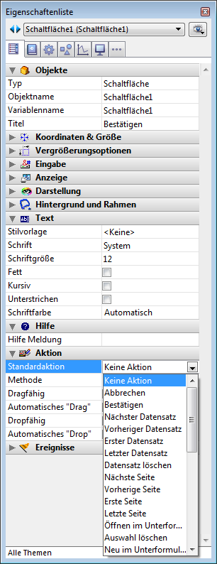Sie müssen in dieser Dropdown-Liste – unabhängig vom Schaltflächentyp – einen Eintrag auswählen. Soll die Schaltfläche eine Aktion ausführen, die nicht in der Dropdown-Liste aufgeführt ist, wählen Sie den Eintrag "Keine Aktion" und schreiben eine Objektmethode, um die Schaltflächenaktion festzulegen. Weitere Informationen dazu finden Sie im Abschnitt