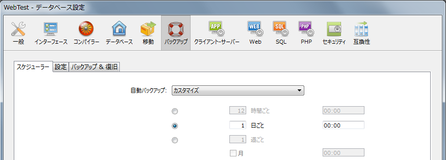 バックアップのスケジュール設定はデータベース設定のバックアップ/スケジューラーページで行います: