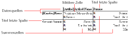 Titelzeile: Diese Zeile zeigt standardmäßig die Namen der Felder bzw. Formeln, die in den Bericht eingefügt wurden. Sie wird auf jeder Seite wiederholt. Sie können den Standardeintrag verändern.