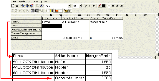 Oberer Bereich: Hier legen Sie Ihren Bericht an. Sie können Datenfelder per Drag-and-Drop, per Doppelklick oder über das Kontextmenü einfügen; die Breite der hinzugefügten Spalten anpassen, Umbrüche oder Formeln löschen, Farben und Zellenränder definieren, etc. Modus Liste: