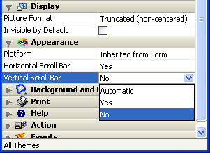 To associate scroll bars, you use the Horizontal Scroll Bar and Vertical Scroll Bar properties found in the “Appearance” theme of the Property List. For Text type objects, hierarchical lists, list boxes and subforms, these properties are set using check boxes.