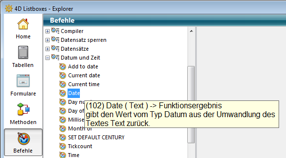 Die Seite Befehle zeigt alle in 4D enthaltenen Befehle, unterteilt in Kategorien. Sie ist dasselbe wie die Befehlsliste im Methodeneditor.