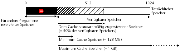 Um diese Größe zu bestimmen, führen Sie folgende Rechnung aus: (Tatsächlicher Speicher – Zu reservierender tatsächlicher Speicher)  X Prozent des Speichers für den Cache. Im anpassbaren Modus variiert die Größe des Cache-Speichers je nach den Erfordernissen der Programme und des Systems. Mit folgenden Optionen können Sie Einschränkungen setzen: