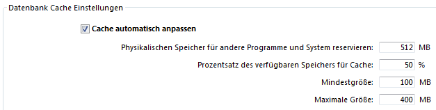 • Prozentsatz des verfügbaren Speichers für Cache = 50%, um Speicher für andere Programme übrig zu lassen.
