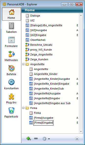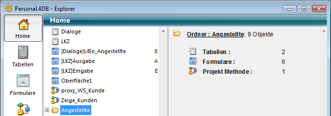 Alle selbst erstellten Objekte der Struktur, also Tabellen, Formulare und Projektmethoden erscheinen immer auf der Seite Home. Sie werden auch auf den anderen Seiten des Explorer aufgelistet.