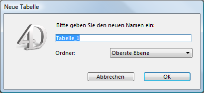 Sie können ein Objekt schon beim Erstellen in einen Ordner legen. Das jeweilige Dialogfenster zum Erstellen von Tabellen, Formularen bzw. Projektmethoden ermöglicht, im DropDown-Menü Ordner den gewünschten Ordner auszuwählen. Objekte werden standardmäßig auf die oberste Ebene oder in den zuletzt im Explorer gewählten Ordner gelegt.