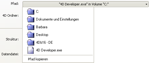 Der obere Bereich gibt Name, Version und Speicherort des Programms und des aktiven 4D Ordners an. Weitere Informationen dazu finden Sie im Handbuch 4D Programmiersprache unter der Funktion Get 4D folder