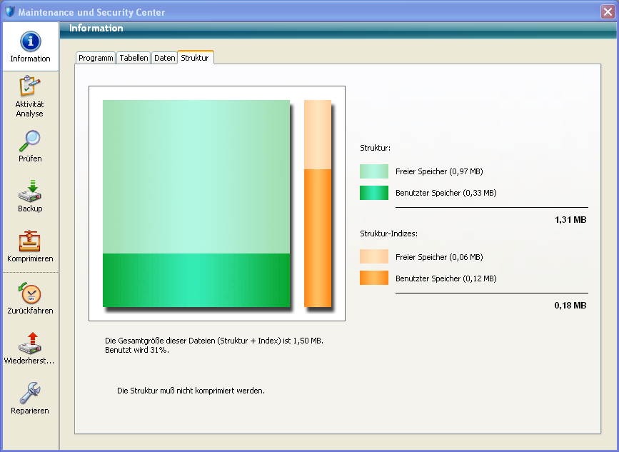 Die Seiten Daten und Struktur zeigen Informationen über die Füll- und Auslastungsrate der Struktur- und Datendatei der Datenbank.