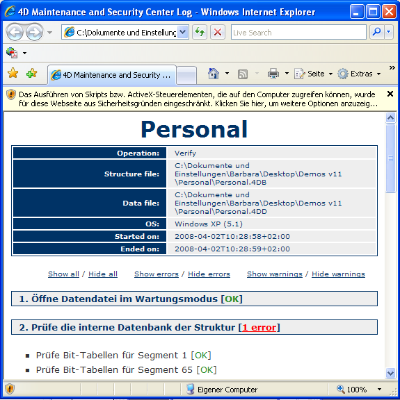 Bei allen Überprüfungsarten generiert 4D ein Logbuch im Ordner der Datenbank. Hier erscheinen alle durchgeführten Überprüfungen und evtl. gefundene Fehler. Gibt es keine Fehler, wird das durch [OK] angezeigt. Das Logbuch hat den Namen DatenbankName_Verify_log und wird im XML- und HTML-Format angelegt.