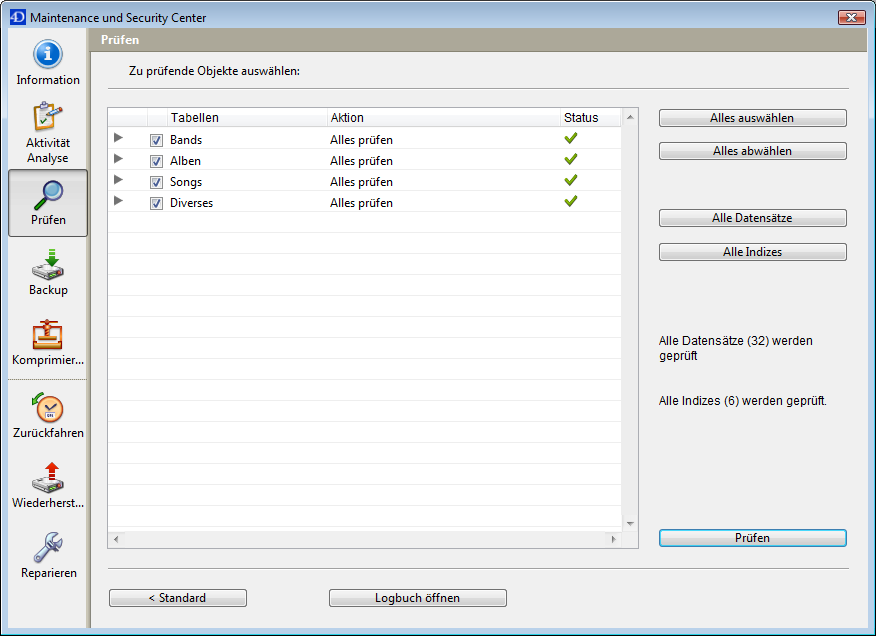 • Datensätze und Indizes prüfen: Startet den kompletten Prozess zum Überprüfen der Daten.