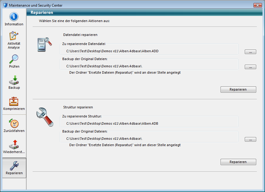 Klicken Sie jeweils auf die Schaltfläche Reparieren, wird bei Bedarf die Datenbank geschlossen und im Wartungsmodus neu geöffnet, bevor die Operation startet