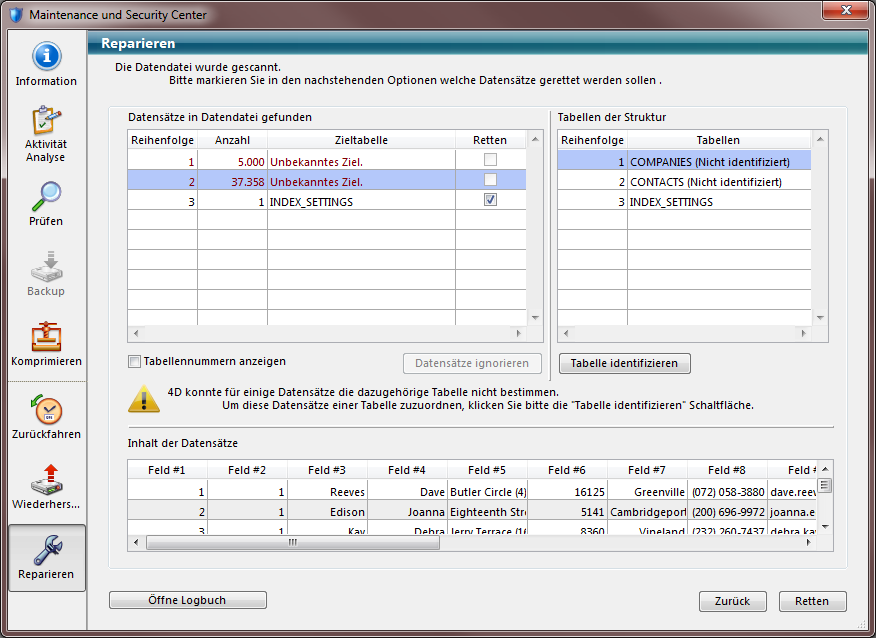 Klicken Sie auf die Schaltfläche Scannen und Reparieren, scannt 4D die Datendatei komplett. Ist die Operation abgeschlossen, erscheint folgendes Fenster:
