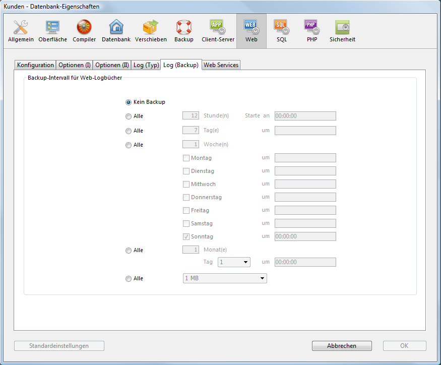 In den Datenbank-Eigenschaften auf der Seite Web>Log (Backup) können Sie automatische Backup Parameter für das Web Logbuch definieren: