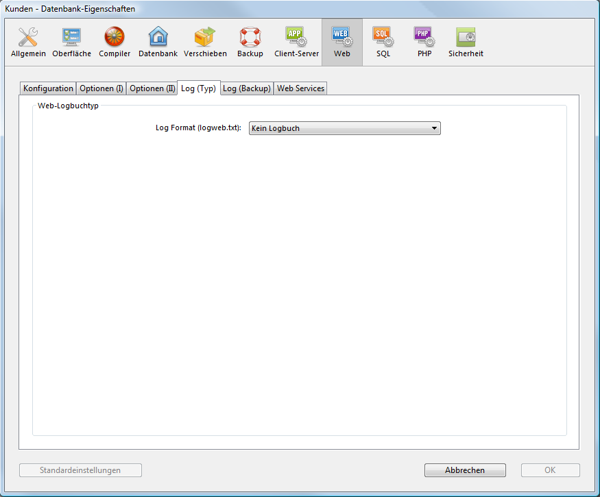 Die Aktivierung des Logbuchs und die Konfiguration seines Inhalts definieren Sie in den Datenbank-Eigenschaften auf der Seite Web>Log (Typ):