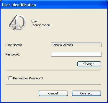 You can force 4D to display the standard password entry dialog box in order, for example, to connect to the database as the Designer or Administrator.