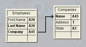Por exemplo, na estrutura que se mostra a continuação, se um registro para a tabela [Empregados] se carrega e mostra para a entrada de dados, o registro relacionado na tabela [Empresas] se seleciona e se carrega. Igualmente, se um registro para a tabela [Empresas] se carrega e mostra para a entrada de dados, os registros relacionados com a tabela [Empregados] são selecionados.