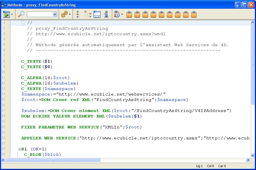Pour appeler une méthode proxy dans votre code, il suffit d’écrire son nom et de lui passer les paramètres requis. Ces paramètres sont déclarés dans la zone d’en-tête de la méthode proxy par l’Assistant Web Services. Conformément à la syntaxe standard du passage de paramètres entre les méthodes dans 4D, ils sont nommés $0, $1, $2... Ils peuvent être visualisés dans les paramètres avancés de la description de la méthode publiée (cf. paragraphe Utiliser les paramètres avancés) et sont parfois décrits dans sa documentation.