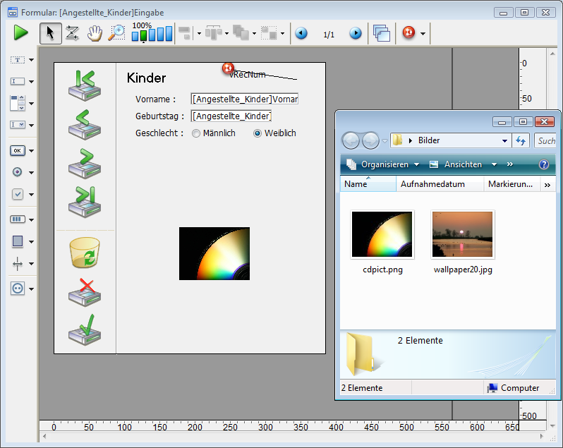 Wenn Sie ein Bild auf der Seite 0 eines mehrseitigen Formulars einfügen, erscheint es automatisch als Hintergrundelement auf allen Seiten. Sie können das Bild auch in ein vererbtes Formular einfügen, das als Hintergrund für verschiedene andere Formulare dient. Das beschleunigt die Operationen in Ihrer Anwendung. Sie können statischen Bildern für Formulare Eigenschaften zuweisen. Die Eigenschaft Wiederholte Anzeige dient z.B. dazu, um ein kleines Bild als Hintergrundbild des Formulars zu setzen. Es wird dann so oft wiederholt, bis die Seite des Formulars ausgefüllt ist.